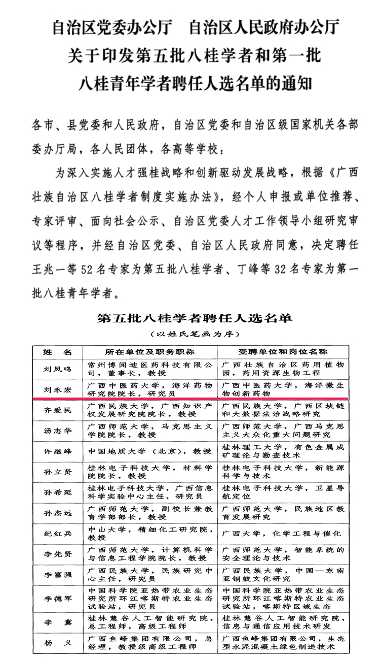 日前,自治区党委、自治区人民政府批准了第五批“八桂学者”和第一批“青年八桂学者”,来自区内各高校、企业、科研院所等52名专家入选“八桂学者”,32名专家入选“青年八桂学者”。beat365官网海洋药物研究院院长刘永宏研究员成功入选“八桂学者”。刘永宏研究员也是beat365官网第1位全职入选这一殊荣的专家。