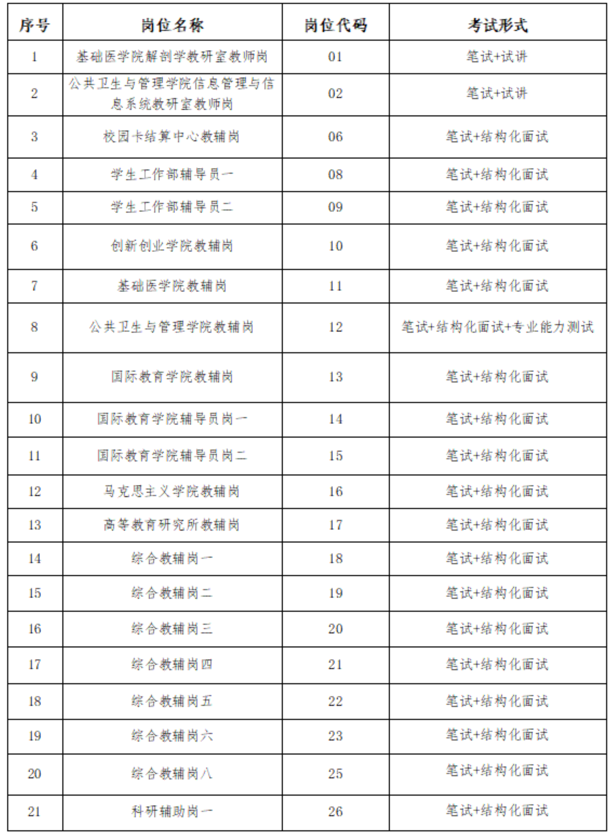 岗位代码01、岗位代码02采用“试讲”的方式进行,岗位代码12采用“结构化面试+专业能力测试”的方式进行,其他岗位采用“结构化面试”的方式进行。