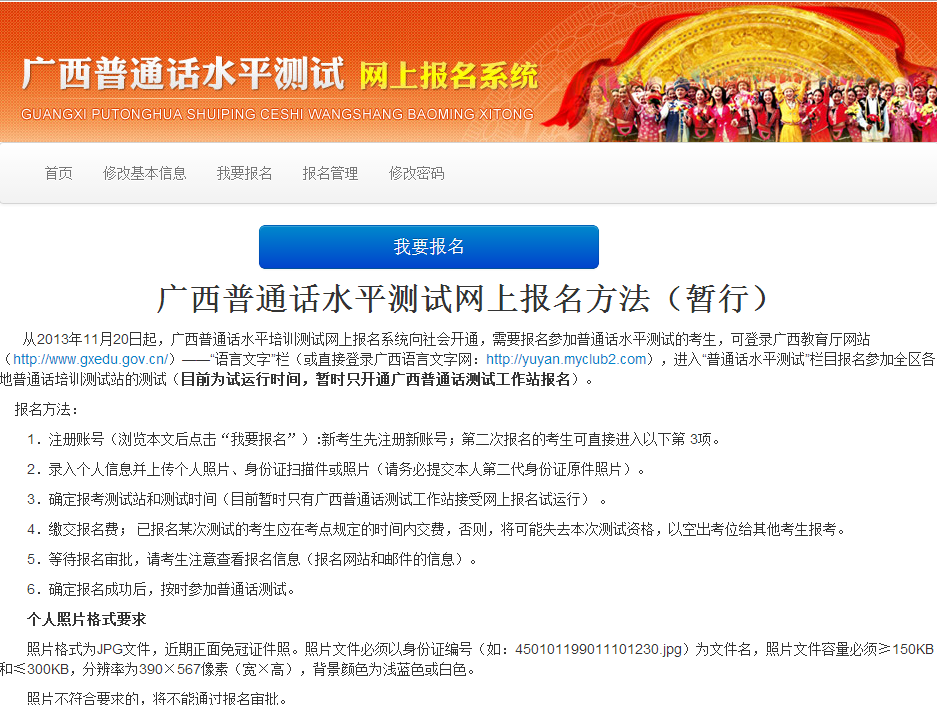 1.请登陆广西普通话水平测试网上报名系统进行报名,具体要求详见附件1。报名网址:http://pthbm.myclub2.com/。
