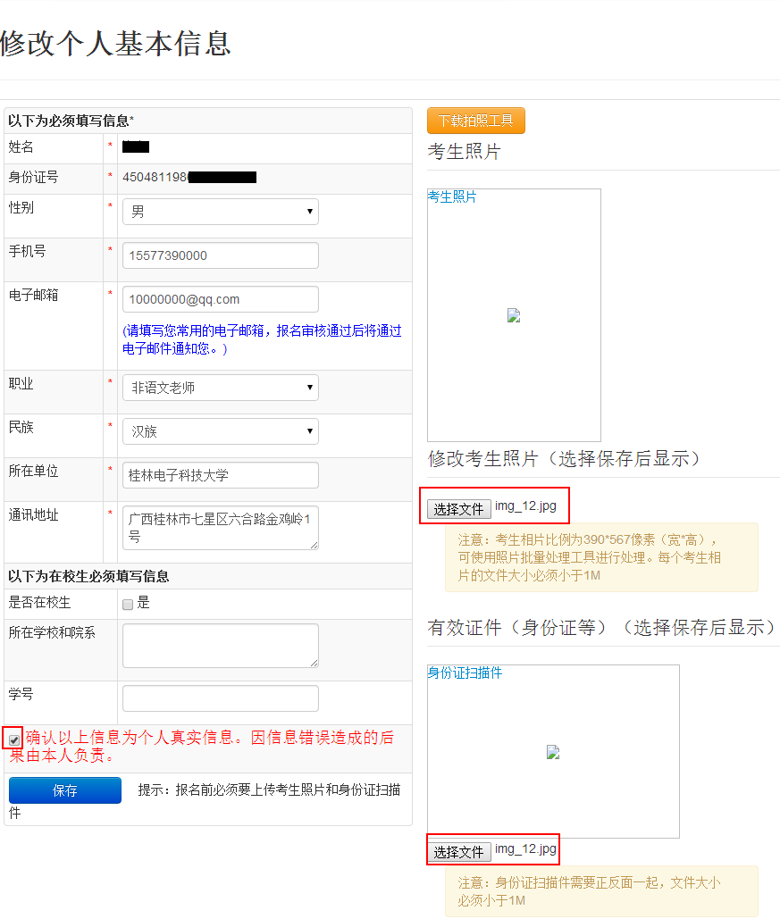 3.考生照片请严格按要求上传390*567像素(宽*高)证件照标准图像;考生身份证图片请按要求上传正反两面(正反两面合并成一个图片上传),否则审核不予以通过。