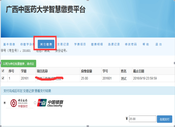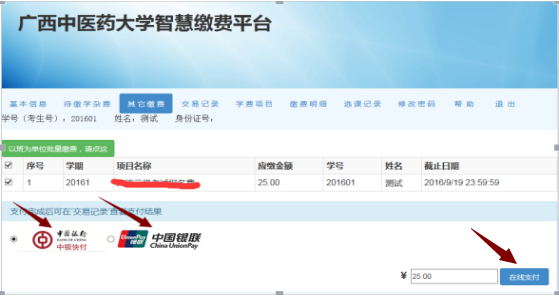 中国银行卡缴费请点选“中银快付”,使用其他银行卡缴费请点选“中国银联”进行网上在线支付,见下图: