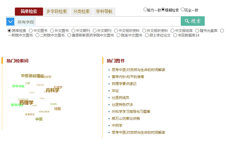 访问http://tsg.gxtcmu.edu.cn/,进入图书馆主页,在校园网环境下读者可以根据需求选择图书馆馆藏纸质图书及馆购电子书检索方式。