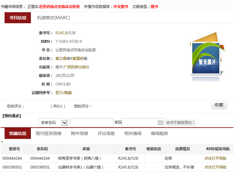 在搜索框中输入书名、作者或关键词,即可获取相关馆藏信息。以图书《壮医药线点灸临床治验录》为例,搜索后得到如下结果: