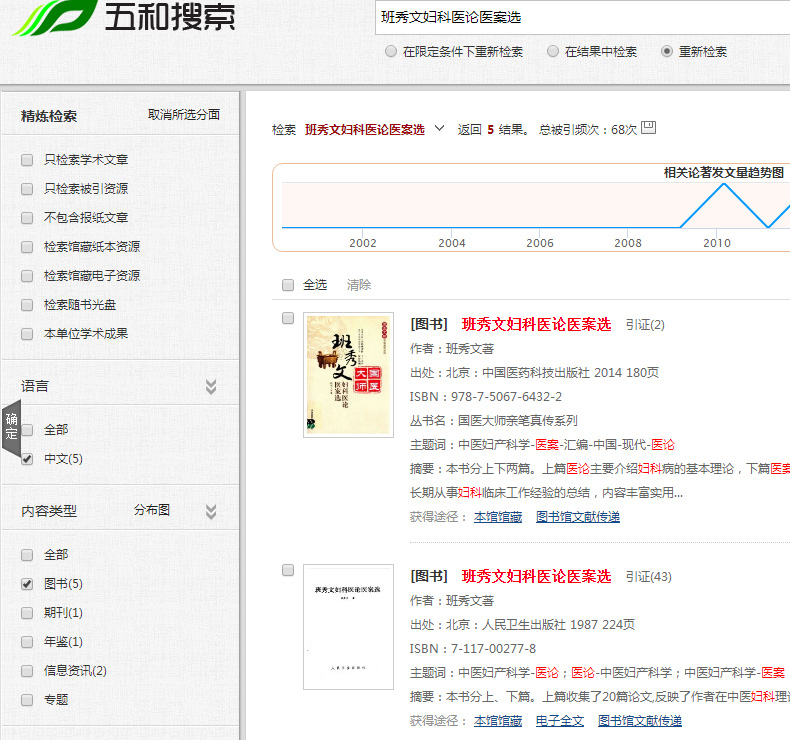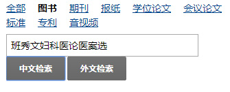 以图书《班秀文妇科医论医案选》为例,我们将搜索范围设定为“图书”,可以得到如下结果: