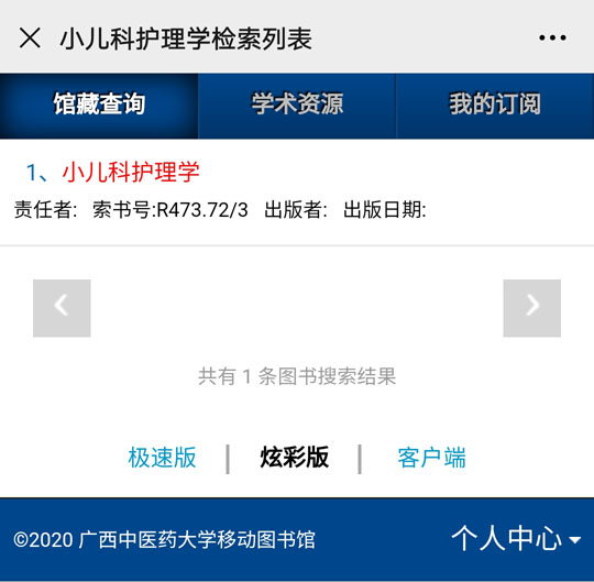 微信关注图书馆公众号(gxtcmutsg),从底端菜单【个人中心】中选择【书目检索】,即可进入查询界面: