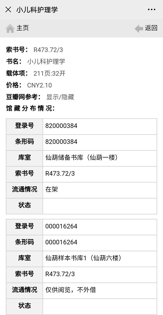 点击条目,可以查看图书的馆藏信息,包括所在库室和流通情况。当库室显示为“明秀××书库”或“仙葫××书库”、流通情况显示为“在架”时,说明该书在图书馆可借。