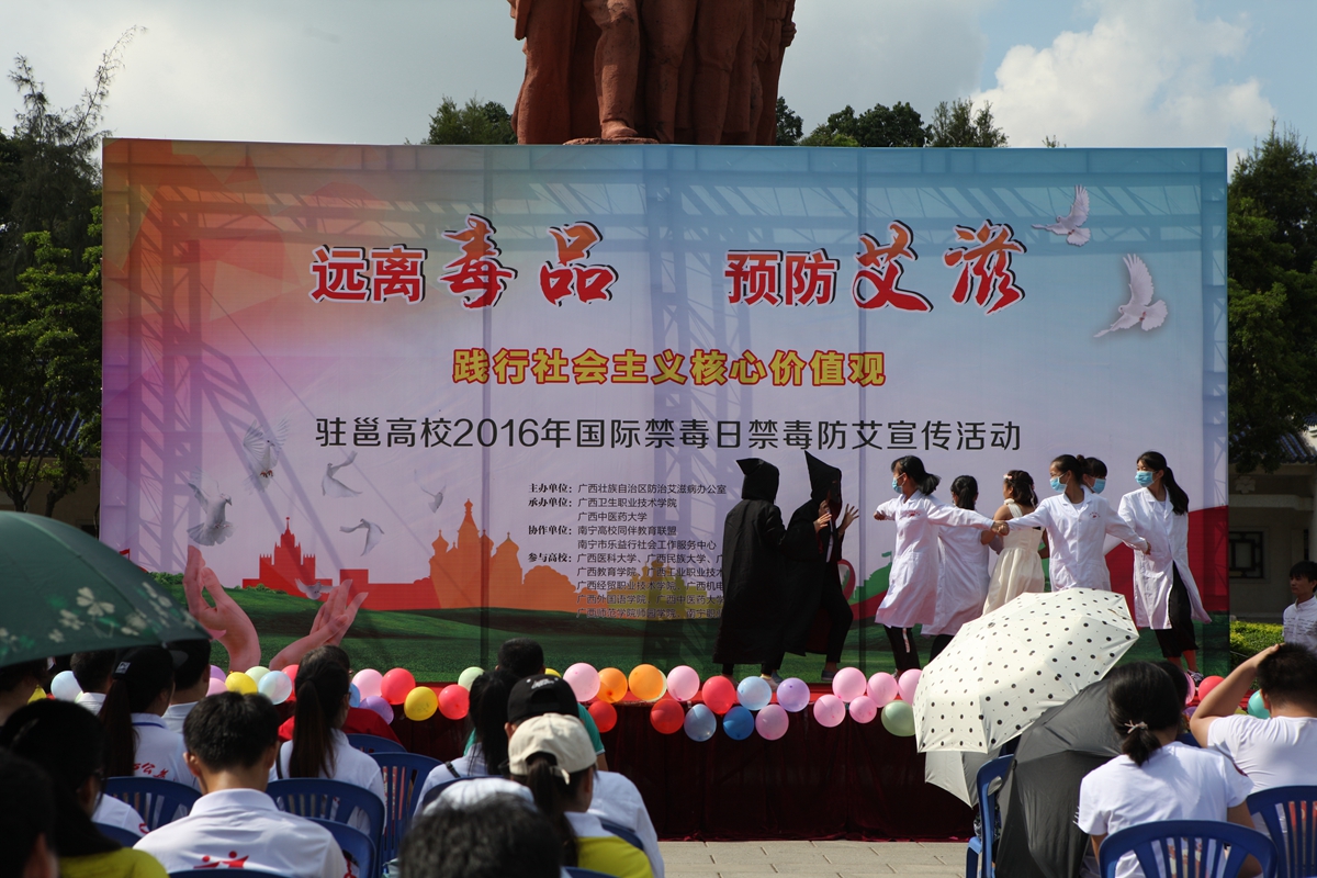 6月26日是第十八个“国际禁毒日”,一场“远离毒品,预防艾滋,践行社会主义核心价值观”驻邕高校2016年国际禁毒日禁毒防艾宣传活动在南湖公园举行,来自驻邕13所高校的志愿者用文艺演出、趣味游园活动向市民宣传了禁毒和艾滋病预防的知识,用行动响应今年的“国际禁毒日”“拒绝毒品诱惑、拥抱阳光生活”的主题,进一步促进我区禁毒宣传工作的深入开展,充分调动广大群众参与禁毒防艾人民战争的积极性。