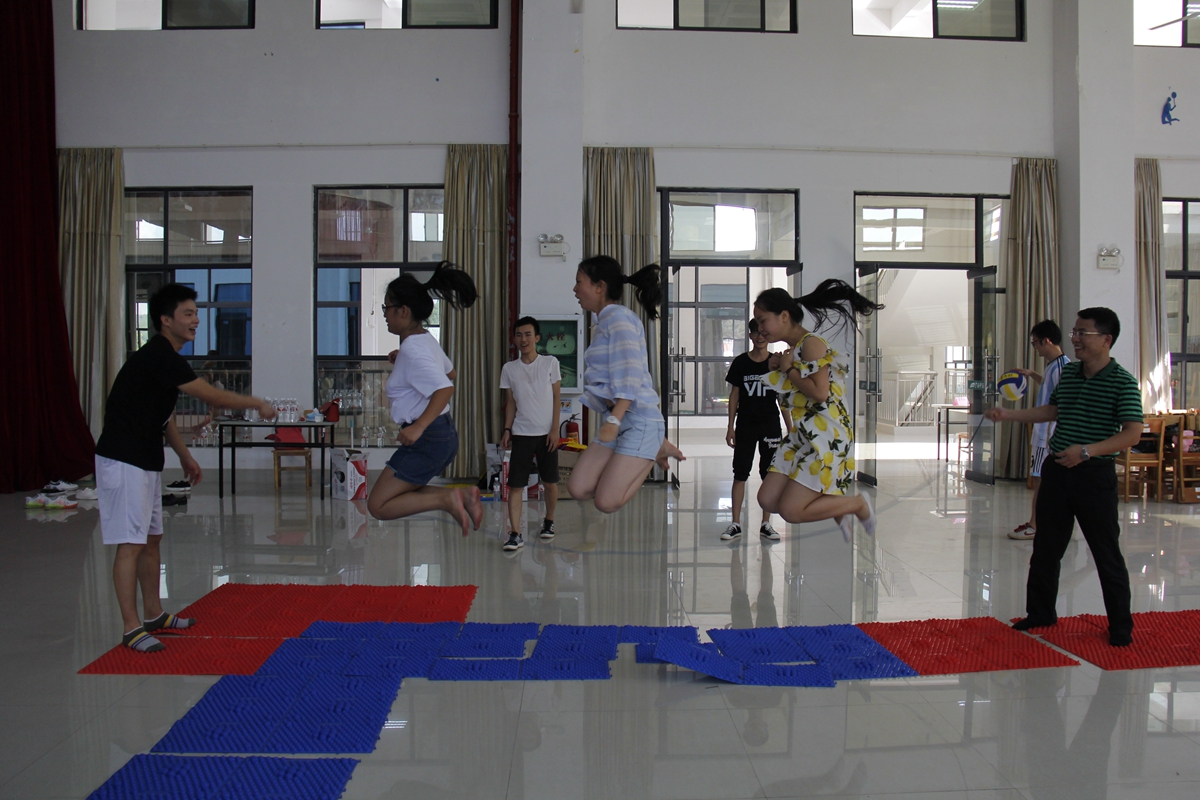 本次素质拓展活动有两个游戏组成:第一个游戏项目是丢沙包大赛,两个学院组合为一个分组,两两PK,计时两队队员存活时间,存活时间长的团队胜利,接到沙包可以复活任意一名队员,直至最后一名队员淘汰即游戏结束。第二个游戏项目是指压板追逐大赛,以学院或组织为团队两两pk,从不同的起点出发,经过跳绳,跨栏下腰,和钻过呼啦圈三个项目,本环节不计算时间,率先追到对方队员即为胜利。