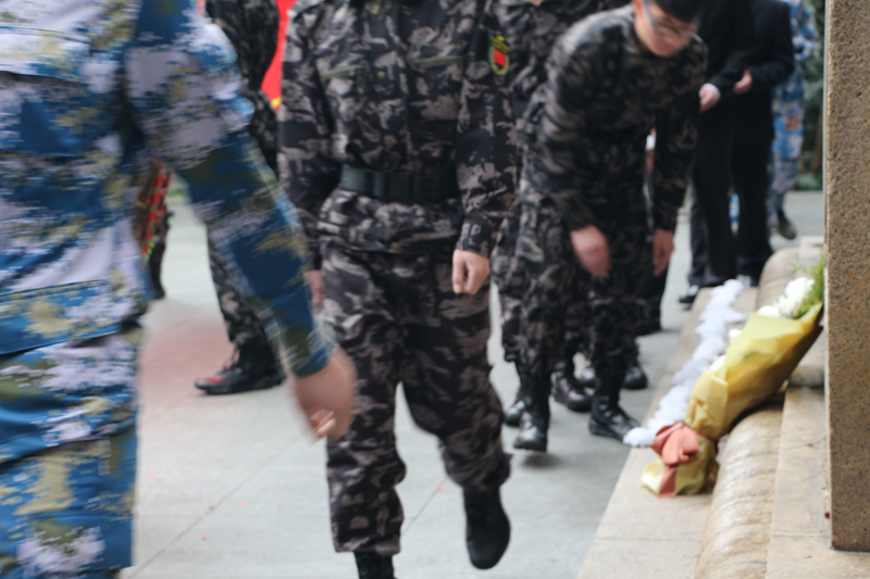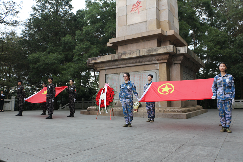 国旗队在烈士纪念碑前出国旗,奏唱国歌,为抗日烈士敬献花圈,默哀一分钟。我们的先辈浴血在战争前线,只为了后代能看到下一个日出;你们在冷夜里燃起篝火,只为了珍惜那刻来之不易的祥和;你们泪别死去的战友继续前行,背负着的是远方的希望。你们用鲜血将国旗染红,唱出残阳下的战歌;你们将青春奉献给祖国,祈祷后世岁月静好。