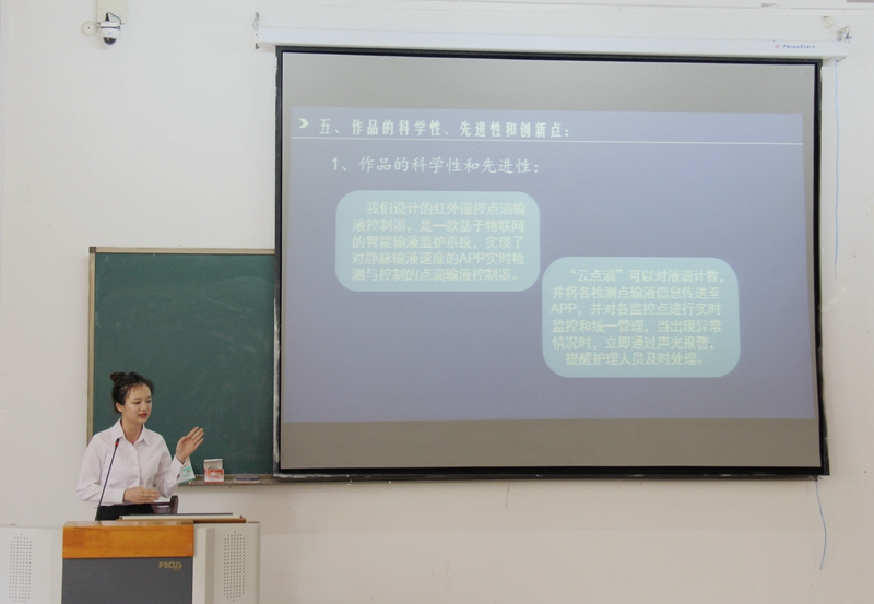 这次参赛的项目,虽然研究的方向不同、形式各异,但都包含了同学们的奇思妙想。例如护理学专业同学设计的“基于手机APP平台输液流量控制器”,其最初的创造灵感来自于医院输液监控问题。他们发现在医院输液的病人常出现家人不在身边,没能及时发现吊瓶里药液输完,结果造成了血液回流进输液瓶的现象。这一现象引发了他们对输液监控问题的关注。后来他们团队通过立项、产品的设计、方案的实施这一系列的过程,项目取得了较大的进展,也赢得了专家们的好评。