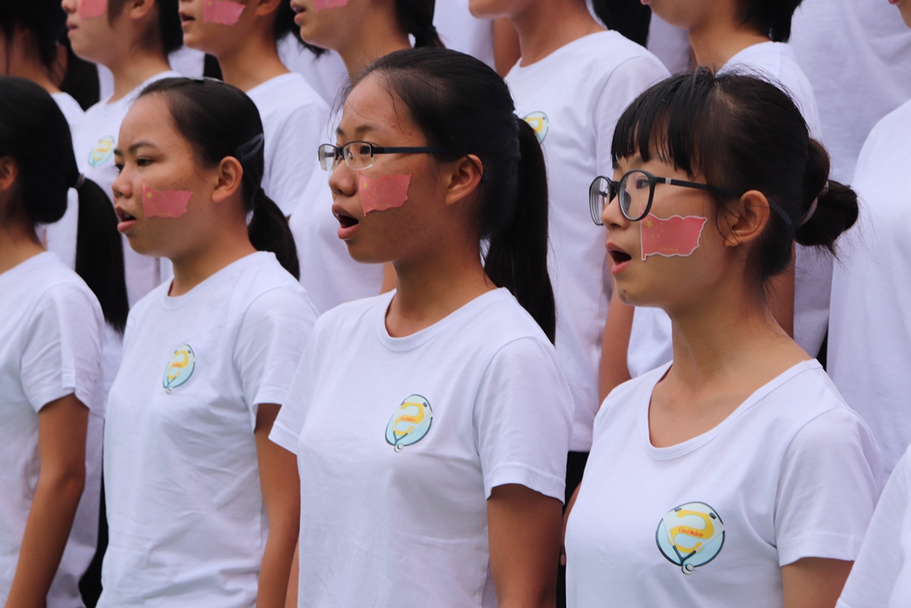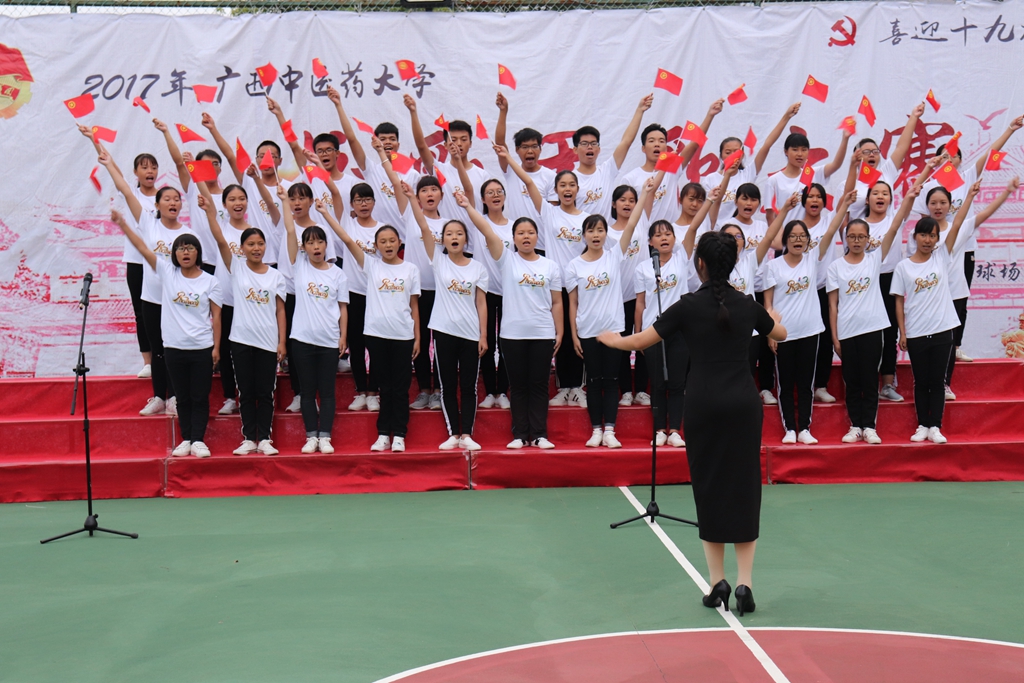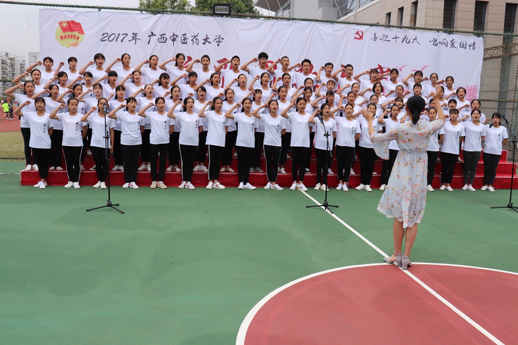 每个班都在用自己方式,表达自己对祖国、学校的热爱。市场营销1班同学手持国旗随歌声摆动,让人耳目一新;药学大参林2班着军装,带着必胜的气势,直击人心。他们庄重威严,气势磅礴,用高亢嘹亮的歌声赢得了在场观众的掌声。