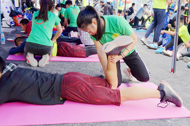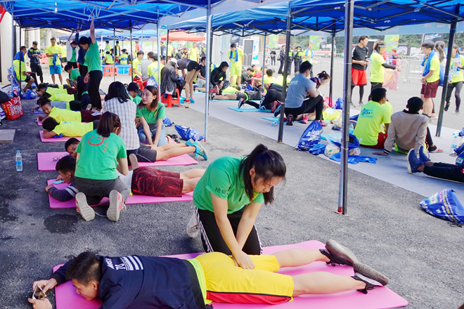 手协的伙伴们一对一地给参赛者进行赛后拉伸,按压等放松手法,还配合进行揉法、拿法、滚法、点法、拨法等手法按摩。为了使运动员能够得到更好的服务,手协伙伴们还做了传统中医治疗方法——踩跷。踩跷疗法是用双足节律性踩踏施术部位治疗疾病的方法,与其他的按摩手法相比,踩跷法具有作用力大、接触面积广、受力均匀、渗透性强等特点。经过一天的辛苦服务,运动员们对手协伙伴们赞叹不已,他们表示,“很感谢手协的同学们给我们提供这么棒的按摩服务,他们辛苦了。”
