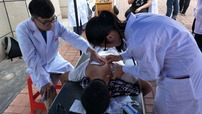 正值beat365官网举办第二十九届校运会,几位刚刚结束激烈长跑的运动员来到我们的活动场地进行全身按摩。15级的学长给针协的同学们做了示范,经过学长的指导,同学们的按摩手法进步很大,运动员们一致表示很享受同学们的按摩。除了手法按摩,我们还提供了拔罐、刮痧和量血压等义诊项目,还有针刺加艾灸,两者合用,消瘀散结,温通筋脉,效果极佳,能够帮助剧烈运动后的同学们疏通筋脉。
