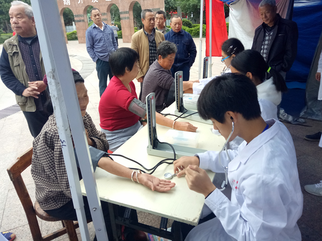 首先就诊的是几位阿姨,志愿者们细心询问了她们的健康状况,帮她们测量了血压,还耐心分析了每位阿姨的身体现状并告诉她们如何保持身体健康,阿姨们竖起拇指为我们点赞。