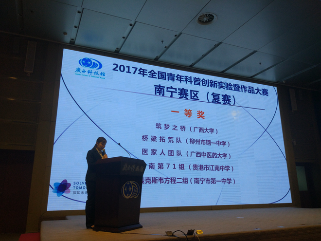 2017年全国青年科普创新实验暨作品大赛以“SOLVE FOR TOMORROW探知未来”为主题,南宁赛区历时两个月,自9月份开赛以来共有3808个项目团队报名参赛,根据成绩排名及专委会审核,最终37支队伍进入现场复赛。经过激烈角逐,来自南宁、柳州、贵港等地的5支队伍脱颖而出,晋级全国决赛。