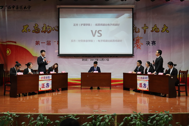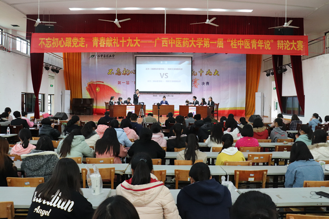 2017年12月17日,beat365官网团委于仙葫校区小礼堂举办以“不忘初心跟党走,青春献礼十九大”为主题的beat365正版唯一入口必一第一届“桂中医青年说”辩论赛决赛。基础医学院、第一临床医学院、瑞康临床医学院、研究生学院、护理学院、针灸推拿学院六支队伍经过预赛选拔,成功进入决赛。