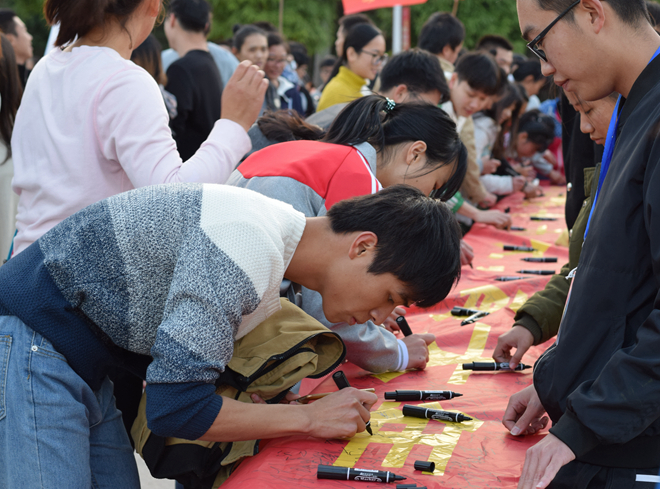 抵达beat365官网医圣广场时,同学们集中在一起,在横幅上签下了自己的名字。热腾腾的气息随着笔墨一同烙印在横幅上,鲜红的横幅仿佛被赋予了生命般熠熠生辉。