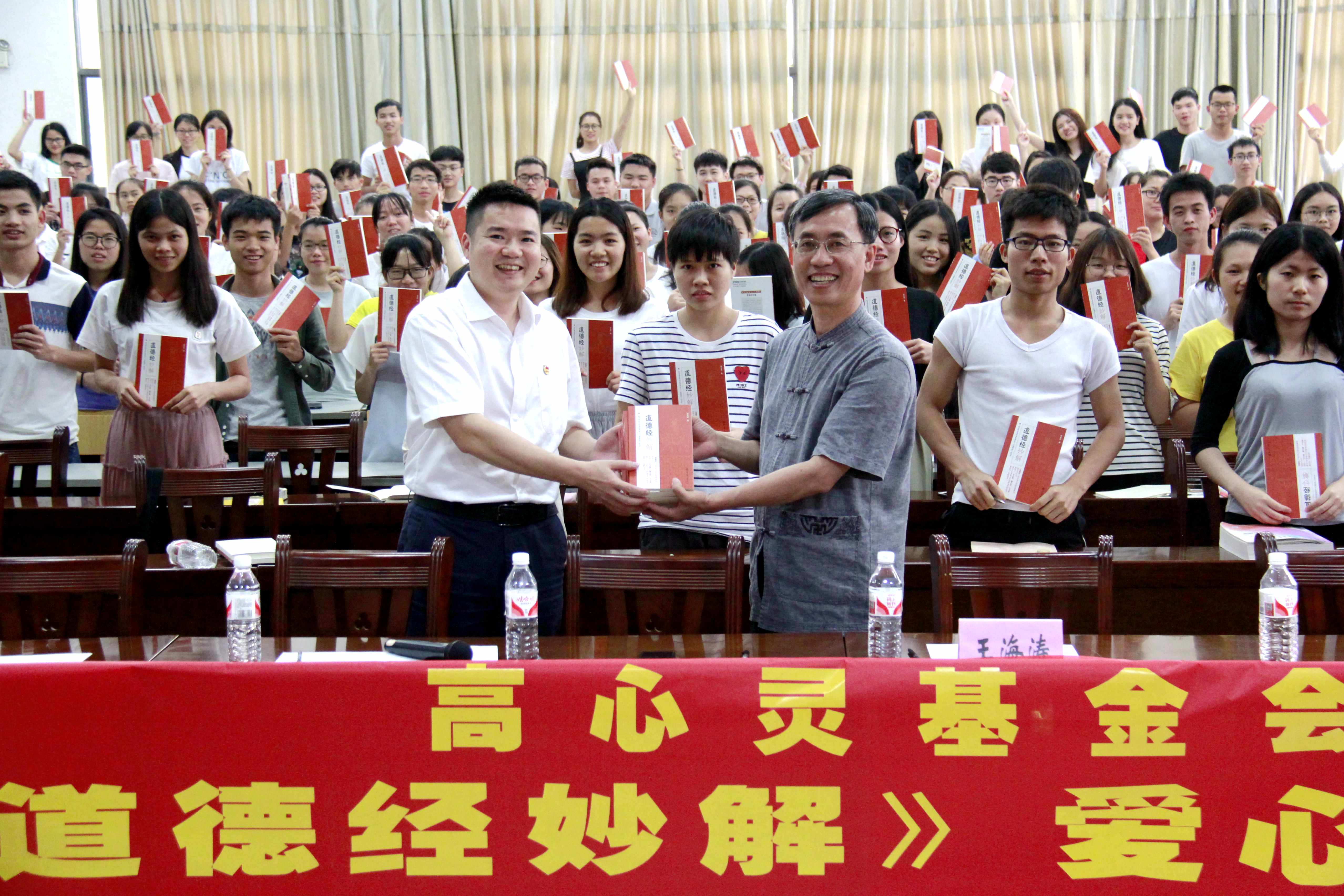 王海涛老师总结学习《道德经》的十大好处,可以明白万物是怎么产生的,宇宙的运转法则是什么;让世人明白我们都是同根同源,我们都是“生命共同体”,全世界各国都是“命运共同体”。大家和谐相处,共存、共享、共荣。讲座最后,他还给现场的每位同学赠送了一本《道德经妙解》。