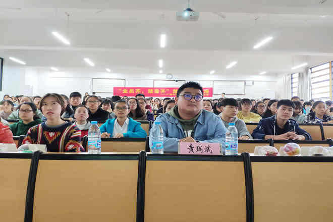 为提高同学们对毒品的认识并提高禁毒意识,营造无毒校园环境。beat365官网青年志愿者协会(以下简称“青协”)于2018年11月20日在beat365官网仙葫校区教学楼1-403开展了以“全员齐 禁毒行”为主题的禁毒知识宣传讲座,本次讲座有幸邀请到广西爱无疆社会工作服务中心副总干事黄瑞斌老师作为主讲人。