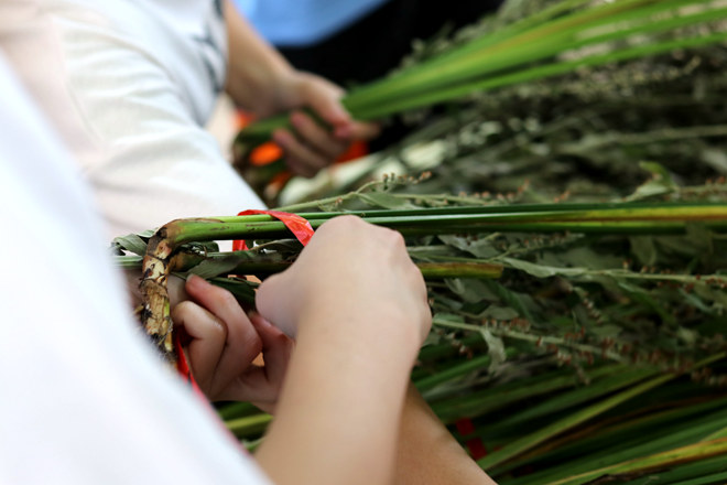 同学们体验包捆艾叶菖蒲