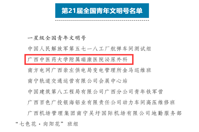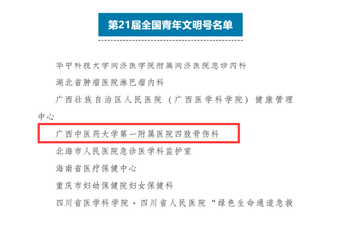 2023年9月19日,第21届全国青年文明号评选结果揭晓,共有1932个集体被评选为“第21届全国青年文明号”,其中有709个集体被评选为首批“二星级全国青年文明号”和1223个集体被评选为“一星级全国青年文明号”。beat365官网有三个集体上榜,beat365官网第一附属医院四肢骨伤科获二星级全国青年文明号称号,附属国际壮医医院风湿病科、附属瑞康医院泌尿外科获一星级全国青年文明号称号。