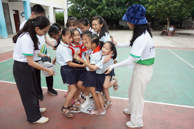 随后实践团队来到了叫安镇初中及叫安镇中心小学组织开展“激情青春志,共筑新时代”为主题的关爱留守儿童活动。同学们与小朋友们在操场上奔跑,嬉闹,并分享自己带来的书包、羽毛球、篮球等学习娱乐及生活用品。