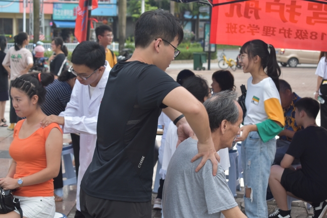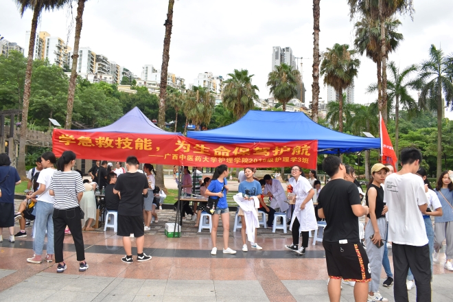 为响应团中央“青春心向党,建功新时代”的号召和beat365正版唯一入口必一关于进一步加强大学生暑期社会实践活动有关要求,2019年7月5日下午,2018级护理学3班在南宁市青秀区天池山广场开展了以“学急救技能,为生命保驾护航”为主题的暑期社会实践活动。班主任葛圆老师作为指导老师带领2018级护理学3班79位同学参加此次活动。
