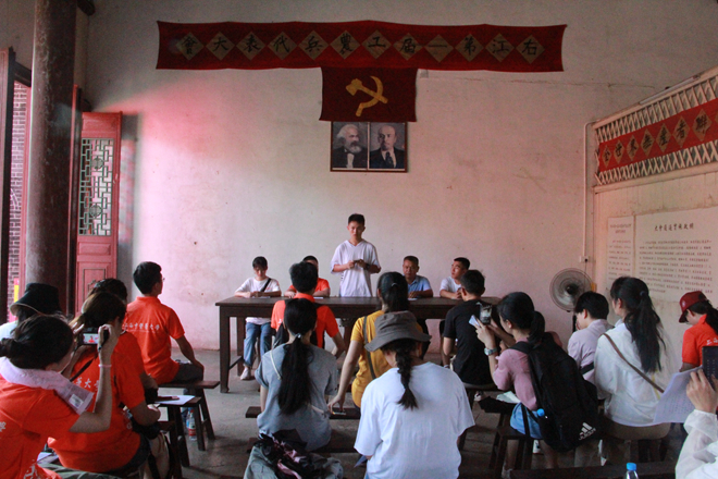 7月18日,为让实践队队员们深入学习解放思想、实事求是、开拓创新、百折不挠的百色起义精神本次实践以体验式教学为主,开展丰富多样的现场教学活动,感受不同的教学主题。重走红军路,实践队一行身着红军服,高举军旗,重走当年邓小平同志挺进右江的路线。炎炎夏日,在崎岖不平的“运枪小道”上实践队队员们相互帮助与鼓励,不屈不挠,勇往直前,感受红军路上先辈们的百色起义精神;红军船上唱红歌,通过简单的歌词与曲调感受振奋人心的力量;参观右江苏维埃政府旧址,并模拟“右江地区第一届工农兵代表大会”召开情景,让队员们如临其境,仿佛回到当年烽火连天的革命岁月,无数次被先辈们的伟大爱国精神所感动。