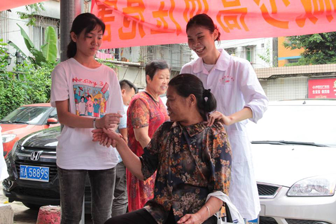 南宁疾病控制中心的专家一一解答村民的疑问,为村民讲解预防高血压病的重要性。同学们为村民们量血压、艾灸、推拿按摩,得到村民的点赞。