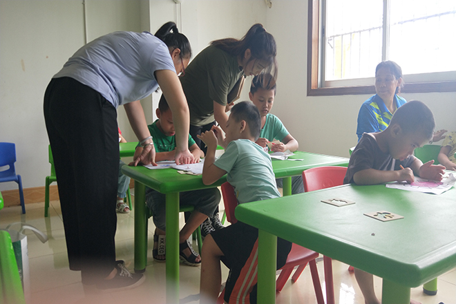 虽然天气十分炎热,但成员们的热情丝毫不减,脸上的汗珠不断滚落,背上的衣布逐渐湿透,仍在认真的打扫,争取做好康复中心防洪工作。室内的成员们则是认真的与这些孩子进行交流,十分耐心的进行教导。本项目活动开展形式多样,不仅是物质层面上的直接服务,更注重精神层面上的服务,用我们所学的知识对脑瘫儿童进行言语训练、社交训练、认知训练等,让脑瘫儿童能更好的融入社会。