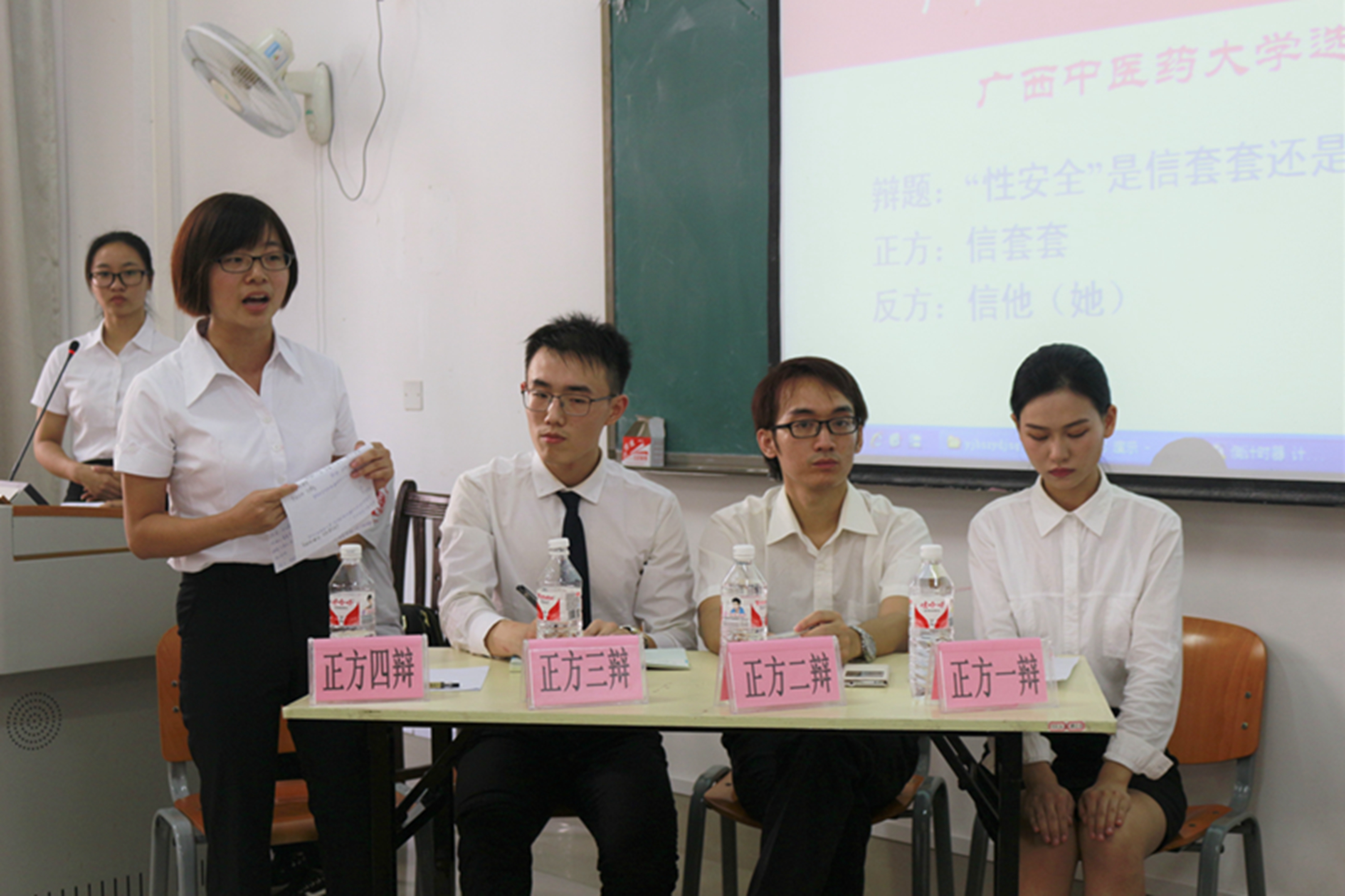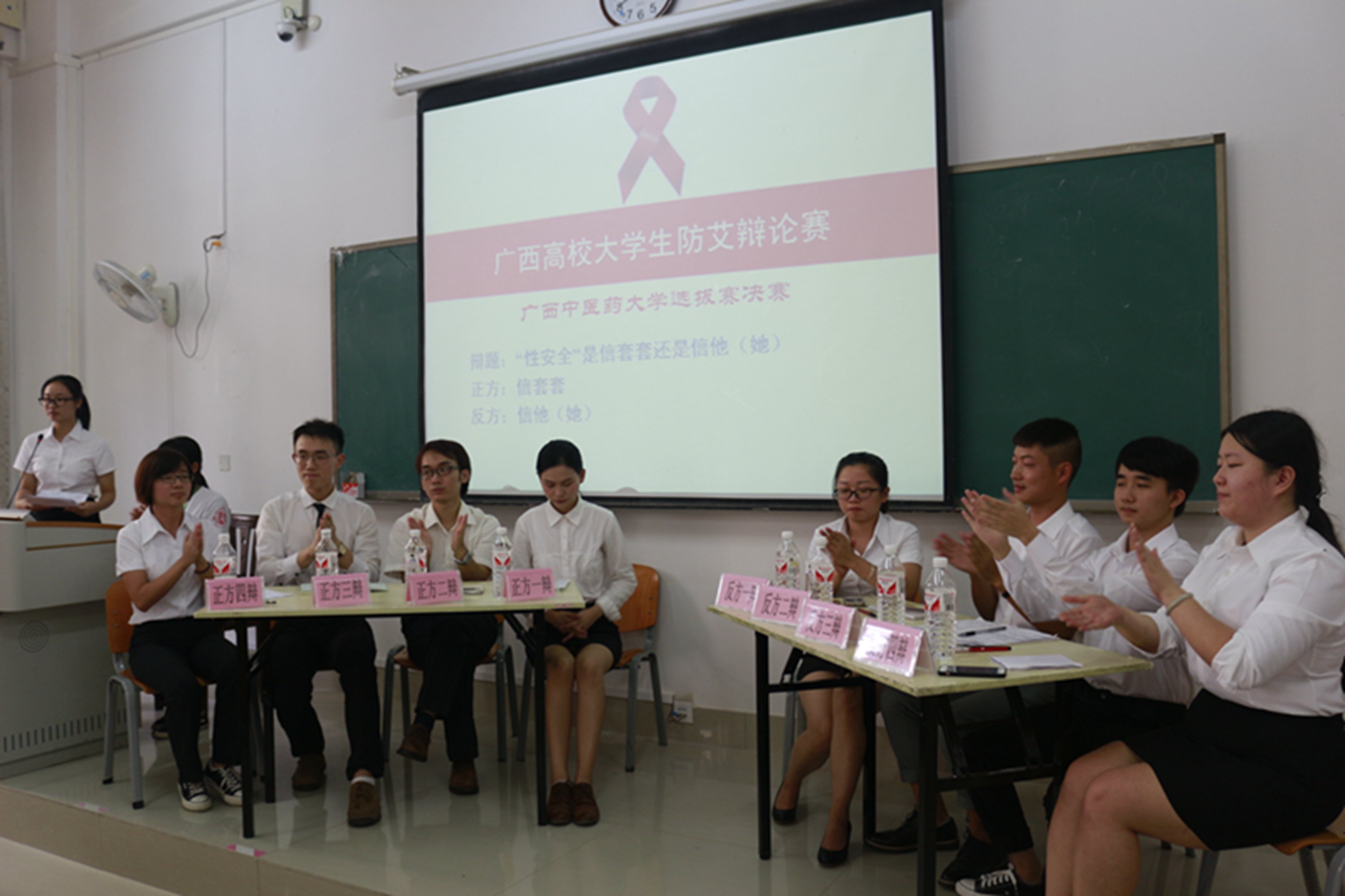本次辩论赛的辩题为“‘性安全’是信套套还是信他(她)”。辩论赛开始由双方分别立论陈述,正方以安全套可靠的质量保证陈述了“信套套”的观点;而作为反方则认为“信他(她)”相对可靠,双方皆以有力的证据及一定的科学依据,阐释了本方的观点。紧接着是激烈的攻辩环节,双方辩手旁征博引,互不相让,精彩的对决将气氛推向了高潮,并引发了阵阵掌声。比赛继续进行,在自由辩论环节,辩论双方更是针锋相对,步步紧逼,比赛进入到白热化阶段,现场观众无不惊叹辩手的能力和灵敏的思路。辩论赛最后进入总结陈词环节,反方四辩提出了道德准则的理念,呼吁人们信他(她)才是可靠的;而正方以人的主观能动性的多变提出质疑,论证了安全套的客观存在保护了人们性安全,最后以激烈的掌声结束了本次防艾辩论赛。