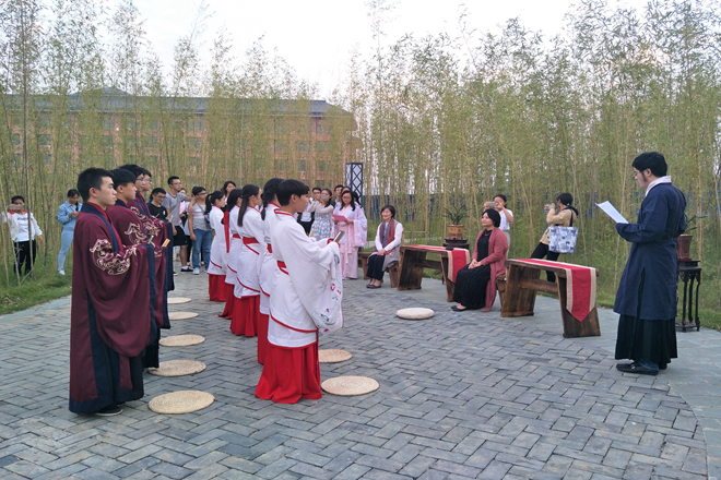 讲座结束后,兰风古琴社全体社员在学校竹林间举行了传统拜师仪式。承蒙尊师垂青,允纳门下,必执礼传扬古琴文化。拜师后,朱行涛、刘布谷两位老师还对兰风古琴社进行了现场琴技指导。