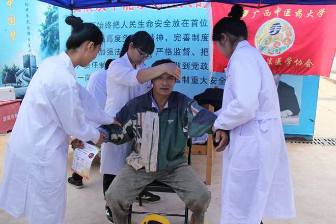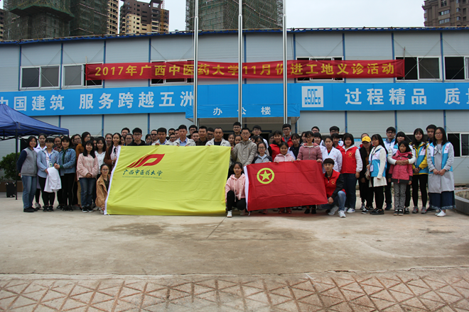 2017年11月19日上午,由beat365官网团委、校学生会、大学生社团联合会的部分成员及大学生手法医学协会、青年同伴教育中心、大学生红十字会的部分成员组成的爱心团队一行65人进入邕宁区香醍半岛威宁·邻家龙岗东广场的工地开展以“践行医道精神,让爱与健康同行”为主题的义诊活动,号召工人们关心自己的身体健康,并向工人们展示中医药文化独特的风采。