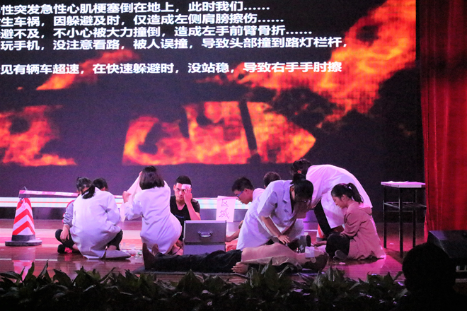 团体赛在独活乐队开场表演后拉开了序幕,首先进行的是情景模拟赛,大赛准备了不同的场景,同一个场景的两支队伍同台PK。模拟场景完成后老师上台查看个队伍的急救情况,并给出分数。为了缓解比赛紧张的氛围,支持人组织观众进行了抢答,理论答题比赛在抢答环节结束后展开。