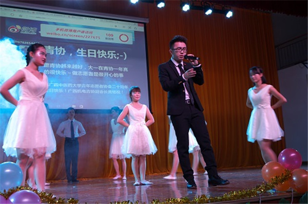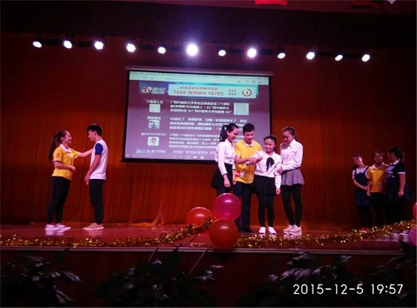 伴随着观众热情的欢呼声,广西高校志愿者联谊晚会暨beat365正版唯一入口必一青年志愿者协会成立20周年晚会在时尚与环保相结合的开场秀——《环保时装秀》中拉开了序幕。在老师及青协现任负责人的发言后,晚会正式开始了。青协各前任会长们将对青协的深情融入到《最美的时光遇到你——青协》中,表达了志愿者对青协的爱与依恋;青协的志愿者们通过表演小品《一家人》来呼吁大家一起加入关爱老人的队伍中;吴睿老师演唱了《夜空中最亮的星》,借以为路人指明道路的明星来比喻永恒不变的志愿服务精神,并赞美了志愿者的无私奉献;《爱留下,守护他》在表演者的精彩演绎下,体现了关爱留守儿童这一深刻主题;其他由校内外各兄弟社团表演的节目,也展示了当代大学生的青春与活力。真正掀起晚会高潮的是纪念青协成立20周年生日蛋糕的出现,大家不约而同地高唱生日快乐歌,为青协送上最诚挚的祝福。最后,在全体合唱会歌《爱就在身边》的歌声中,此次晚会圆满地落下了帷幕。