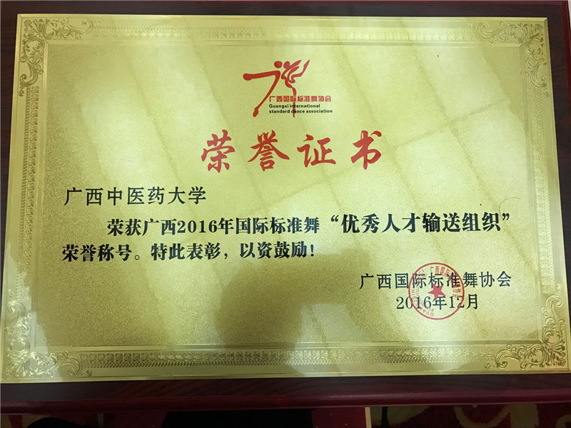 2017年1月12日,beat365正版唯一入口必一荣获广西2016年国际标准舞“优秀人才输送组织”的荣誉称号,该奖由广西国际标准舞协会颁发,为beat365正版唯一入口必一体育部的辉煌战绩中再添一枚奖牌。获得“优秀人才输送组织”这一荣誉称号,是对体育部训练下的拉丁舞队的极大肯定!