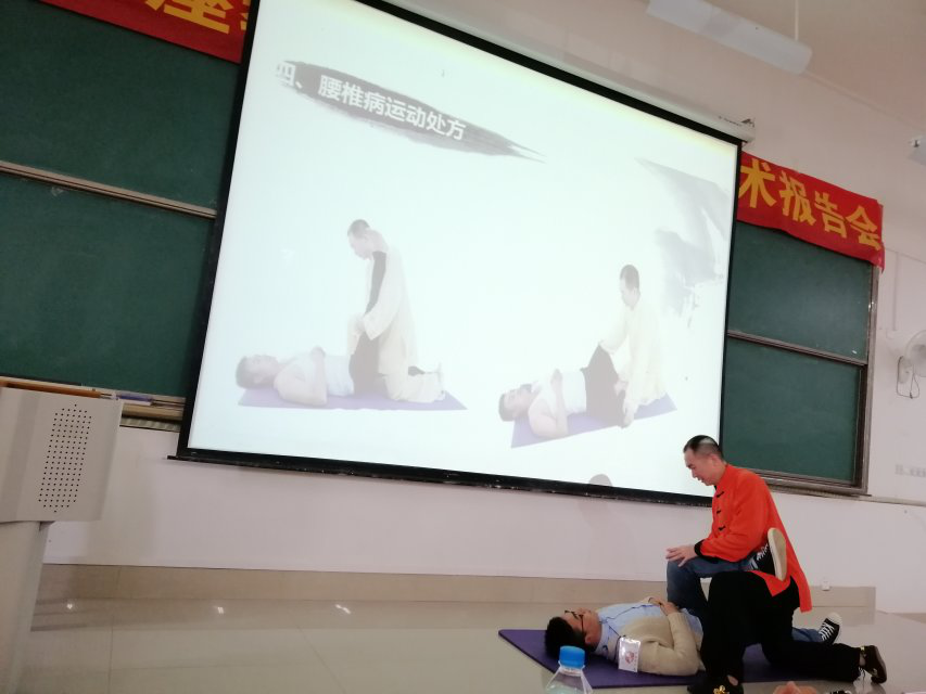 仪式结束后,鄢行辉教授做了题为《中医运动康复技术》的学术报告,介绍了中医导引处方、传统针灸、点穴整脊理筋等疗法在颈肩腰腿疼及运动损伤防治中的运用,并与现场师生互动交流,学术报告会在老师同学们的热烈掌声中圆满结束。