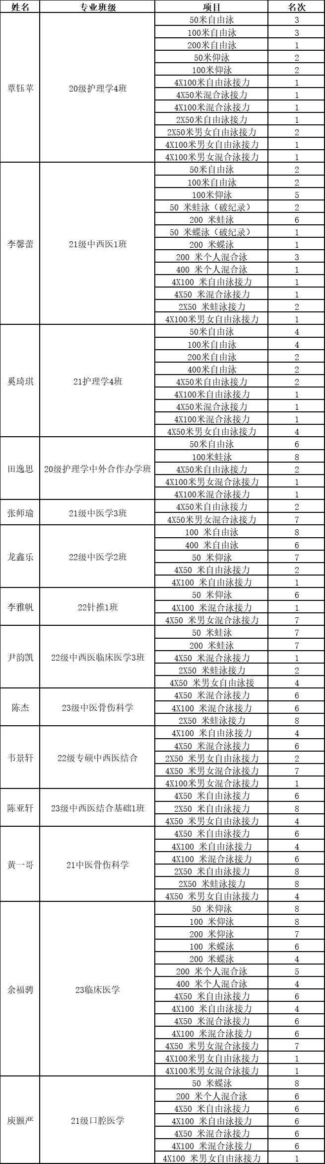 附游泳队比赛成绩:
