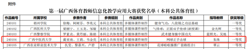 本次大赛由广西学校体育卫生艺术学会主办,比赛项目包括数字资源制作类、教学与数字体育资源应用类两大类,旨在推动信息技术与体育教学的深度融合,不断提升体育教育的信息化水平。自接到赛事通知后,体育部领导高度重视,精心谋划,周密部署,参赛教师认真研究竞赛内容,利用课余时间积极准备,反复修改完善参赛作品,力求完美。最终不负众望,斩获佳绩!