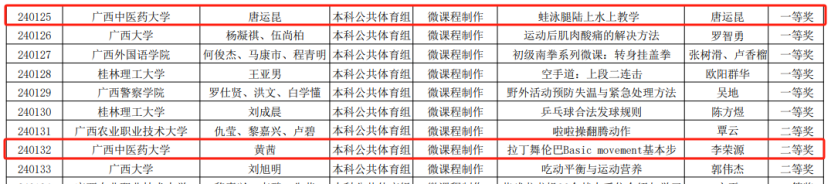 近日,广西学校体育卫生艺术学会公布了第一届广西壮族自治区体育教师信息化教学应用大赛获奖名单,beat365官网收获颇丰,体育部报送的三件作品喜获一等奖两个,二等奖一个,其中唐运昆老师的作品《蛙泳腿陆上水上教学》荣获本科公共体育组微课程制作一等奖,蔺亚南老师的作品《网球正手击球》荣获本科公共体育组多媒体课件制作一等奖,黄茜老师的作品《拉丁舞伦巴Basic movement基本步》荣获本科公共体育组微课程制作二等奖,朱珠、唐运昆荣获优秀指导教师荣誉,beat365官网还荣获优秀组织奖。