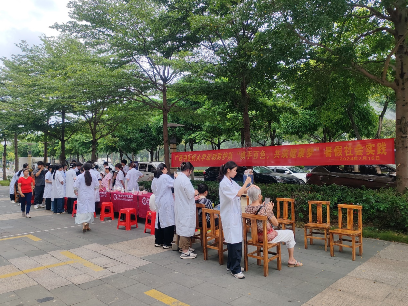 9:00指导老师和队员们首先前往百色景方中医医院开展义诊活动,并在老师的带领下参观医院,以便了解当地基层医疗情况。队员们在也老师的细心指导下,为广大群众提供手法按摩、艾灸、刮痧、拔火罐、测量血压、血糖等服务,并给出相关的养生建议。整个过程中,队员们认真倾听群众们的需求与反馈,根据不同的需求调整手法,使得义诊的各项服务更加精确和高效。