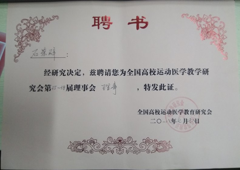 全国高等院校运动医学教学研究会是我国最早的学术组织之一,截止今年已经举办35届学术会议,经理事会研究决定,聘请石荣群为全国高校运动医学教学研究会第35—38届理事会理事,希望能在运动医学学术领域作出应有贡献,为beat365官网争得相应的学术影响力。