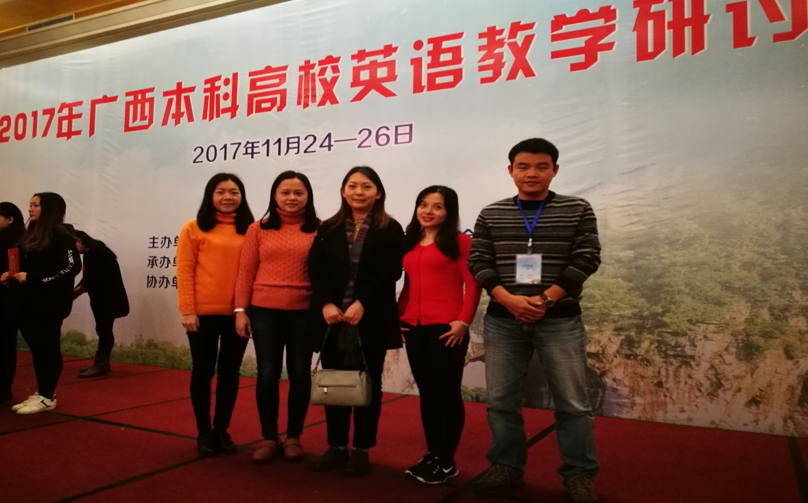 2017年11月24-26日,由广西本科高校英语教学指导委员会主办的2017年广西本科高校英语教学研讨会在桂林举行,外语部陈立群主任带领教务科研办主任何严、大学英语(一)教研室主任蓝莹等教学骨干一行5人参会。