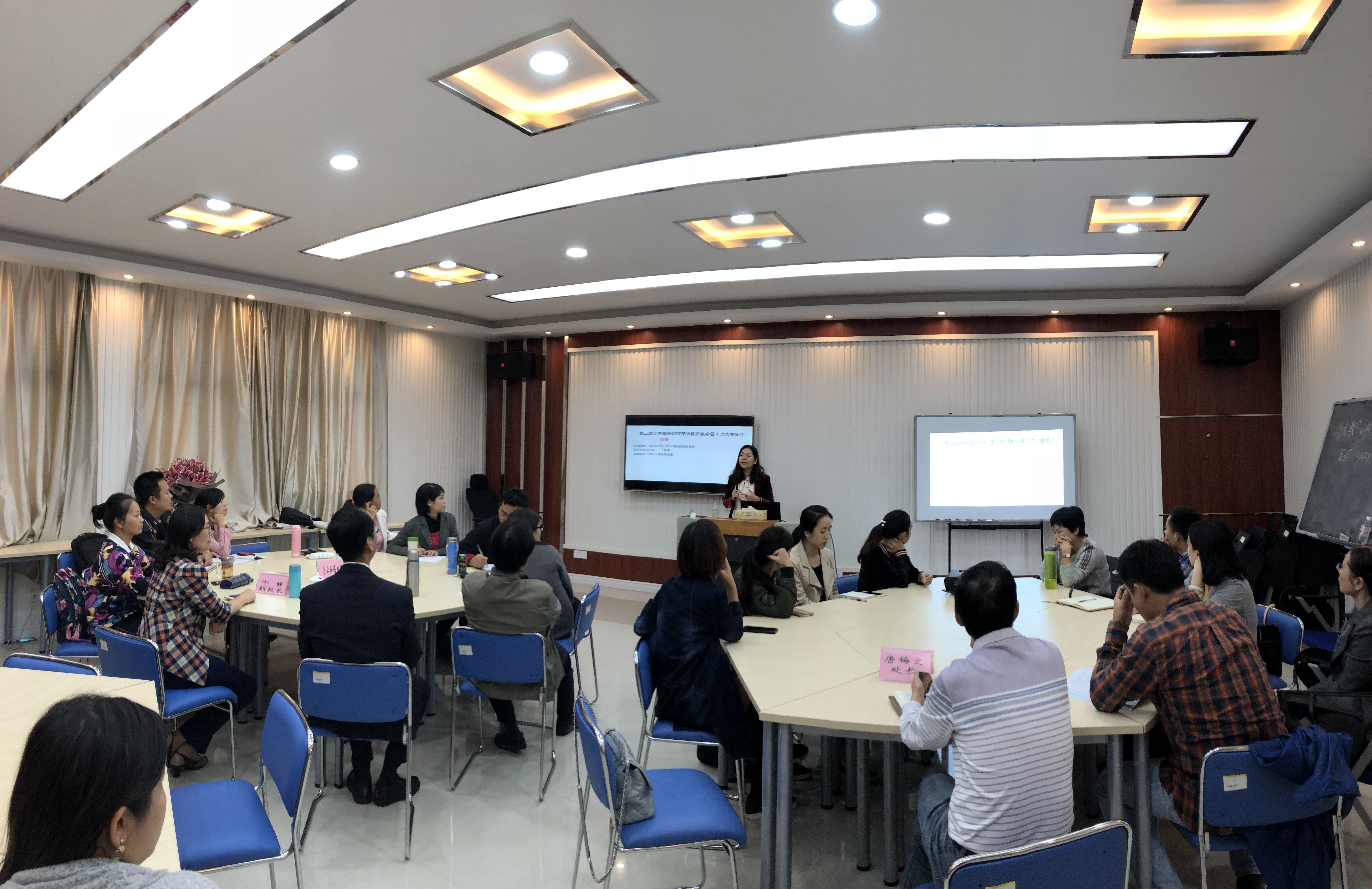 10月26日下午,外语部在教学楼1-503沙龙教室举行教学大赛获奖经验交流会,由刚刚荣获第三届全国大学英语教学基本功大赛一等奖的何严老师进行经验分享,外语部副主任周锋主持本次会议。
