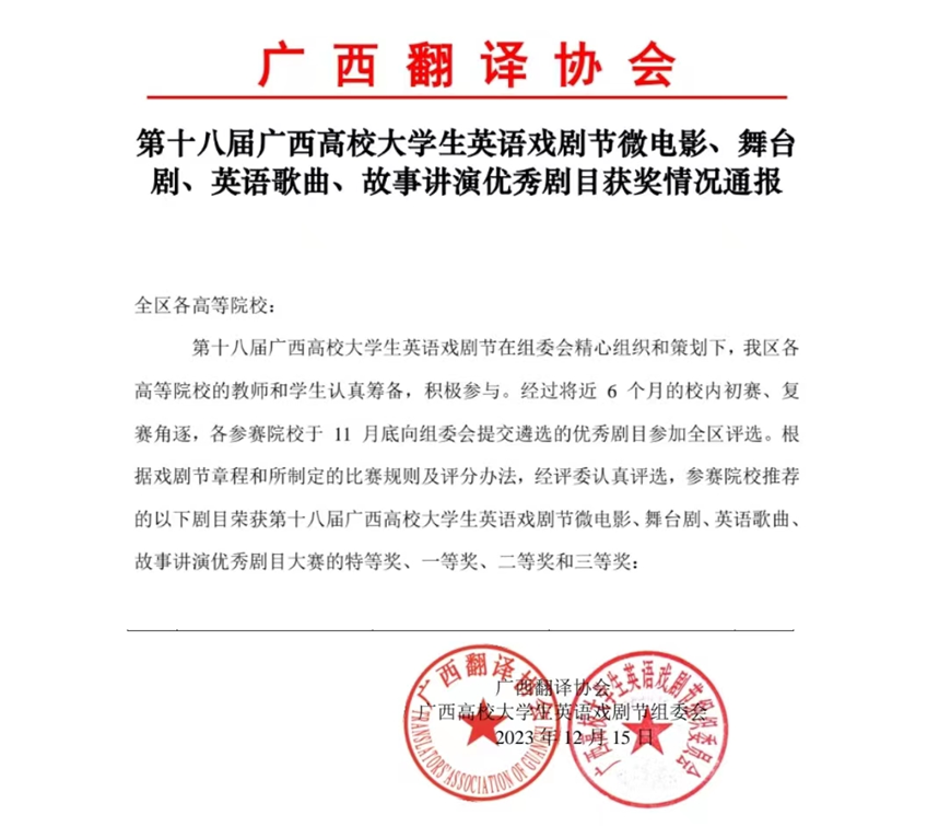 英文歌曲比赛是广西高校大学生英语戏剧节的重要组成部分,吸引了来自广西各大高校众多才华横溢的学生参加。外语部在11月成功举办beat365正版唯一入口必一第一届校园英文歌曲大赛暨第十八届广西高校大学生英语戏剧节英文歌曲演唱赛校园选拔赛,最终选出了三位同学代表beat365官网参赛。三位同学不负众望,在区赛中展示了他们出色的歌唱才能和扎实的英语功底,取得优异成绩。
