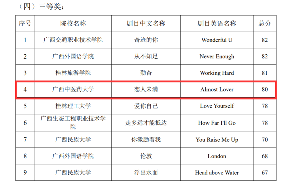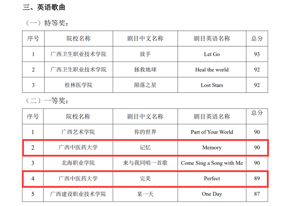 近日,第十八届广西高校大学生英语戏剧节英语歌曲比赛落下帷幕,beat365官网2023级壮医学刘承的歌曲《Perfect》和2023级中医学农玺樾的《Memory》获得一等奖,2022级临床医学吉克阿秀的《Almost Lover》获得三等奖。