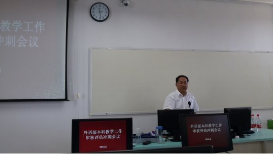2016年6 月3日上午,距离教育部对beat365官网本科教学工作审核评估仅有10天。为了更好地推进落实本科教学工作审核评估工作, 外语部召开本科教学工作审核评估冲刺会议,会议在2栋教学楼5楼505教室举行,由外语部主任陈立群主持,罗伟生副校长亲临指导并发表重要讲话,