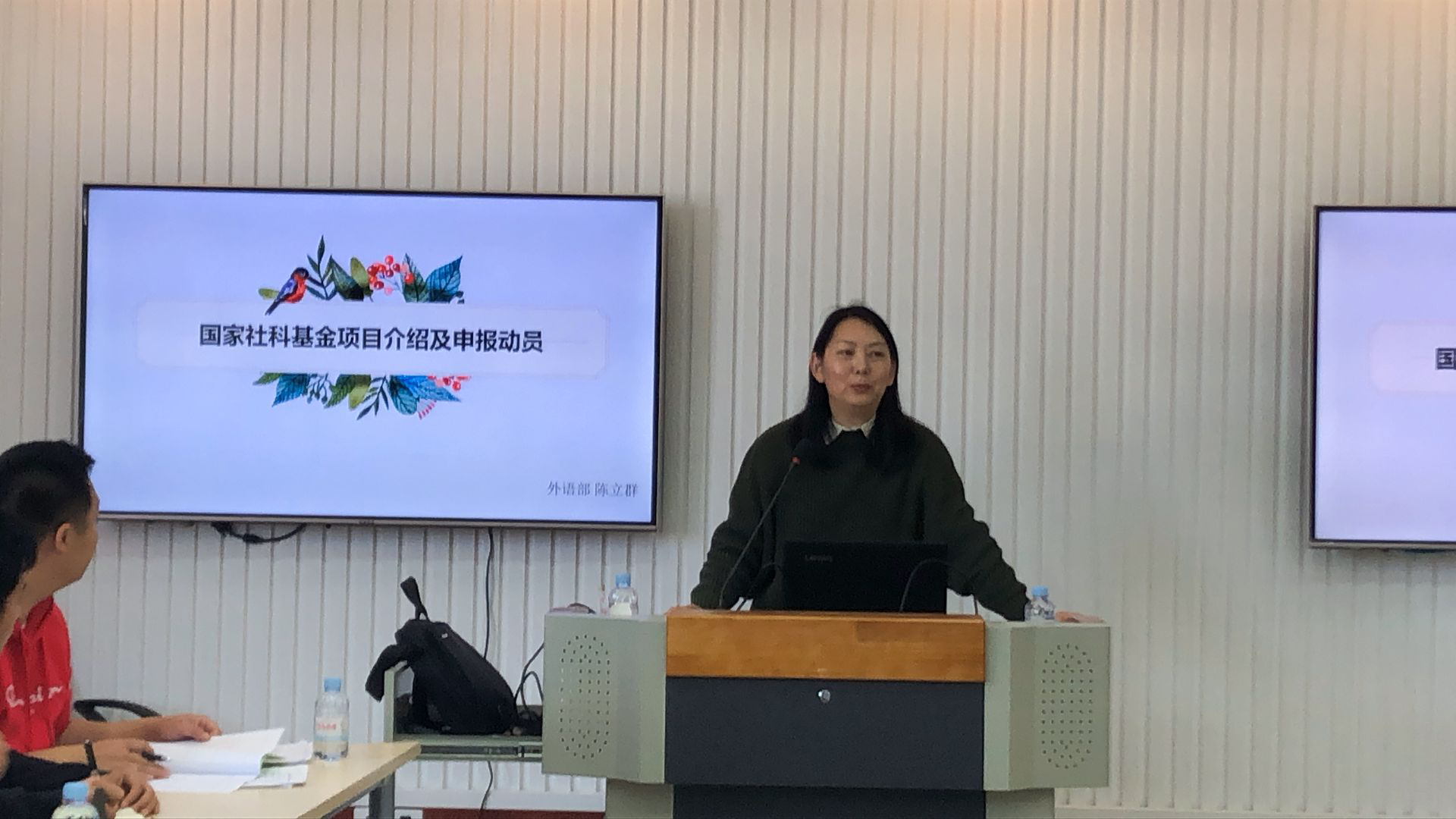 2020年1月10日上午9:00-10:30点,外语部全体人员在教学楼503沙龙教室举行部门2020国家社科基金项目申报动员会暨培训讲座,此次会议由外语部主任陈立群主讲。