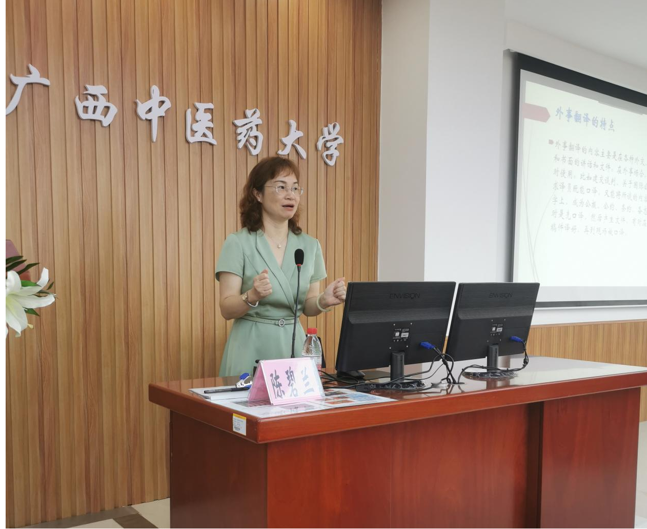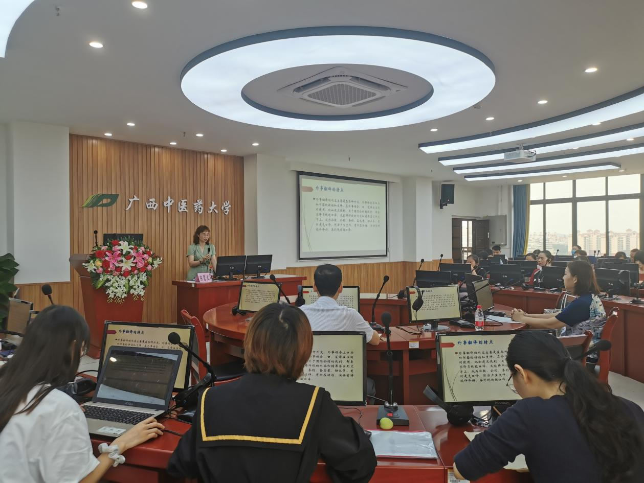 为了提升广大师生对外交流和传播中医的能力,提升翻译硕士点建设水平,外语部本学期开始举行“杏林译路”系列讲座。6月14日上午,广西大学外国语学院副院长陈碧兰博士应邀举行第一讲,主题是“外事外交口译的特征及译员素养的提升”。外语部全体教师、MTI学生以及来自全校的近百名教师参加了此次讲座。外语部副主任周锋主持讲座。