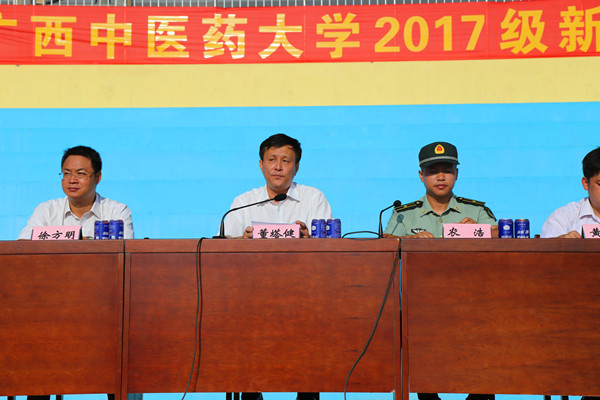 董塔健代表学校向2017级新生表示热烈的欢迎和良好的祝愿,向承训部队官兵表示衷心感谢。他指出,历年来,学校高度重视新生军训工作和国防教育。大学生军训,不仅能学到军事知识和军事技能,而且能强健体魄,锻炼意志;还能增强同学们的现代国防观念和保卫祖国、建设祖国的坚强信念。这既是大学生成才的需要,也是国防建设的需要。他向参训学生提出三点希望和要求:一是认清形势,提高认识;二是严格要求,刻苦训练;三是敢于吃苦,严守纪律,虚心学习,牢记安全。